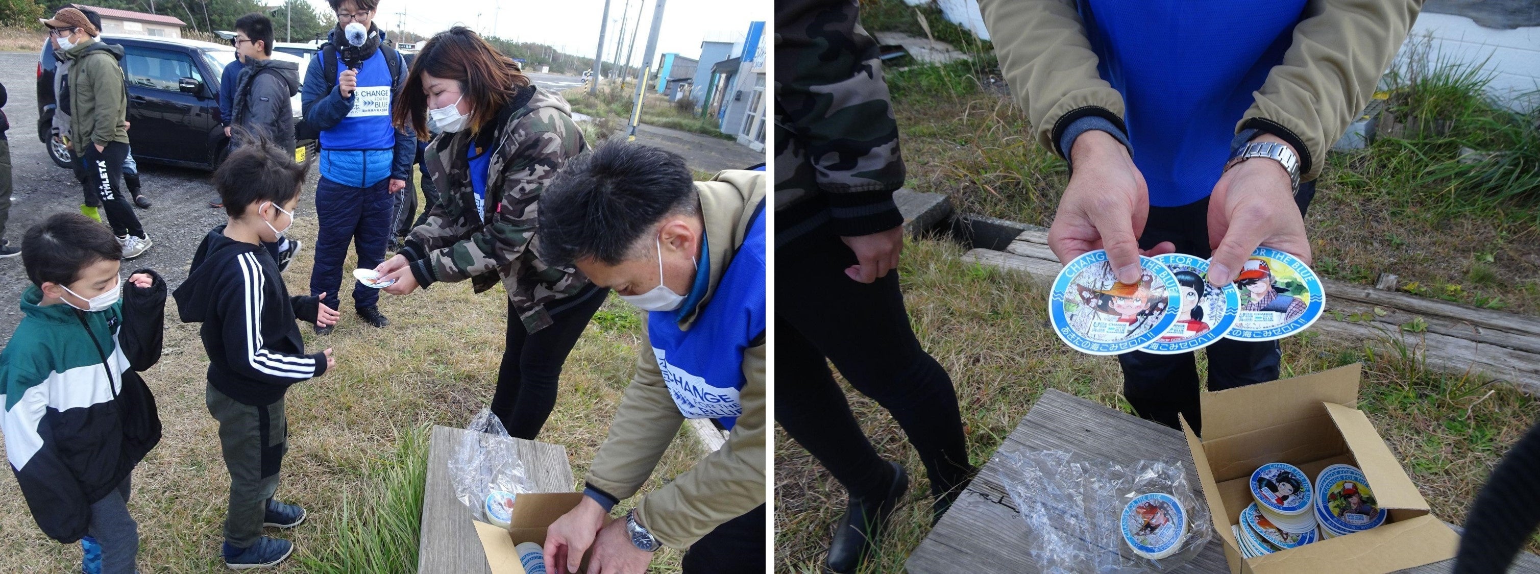 釣り場のごみ拾いや、ごみ抑制、釣り場のルールやマナーを再確認してもらう目的として作られた「釣りキチ三平ステッカー」が徐々に釣り人達の間に知れ渡り人気を集め始めています。参加者の中にはすぐにでも自分の船や釣具に貼りたいという声もあがり、今回の釣り場での清掃活動に協力してくれた方々にも配布し喜ばれました。三平オリジナルステッカーは、漫画/釣りキチ三平の人気キャラクターである三平・ゆりっぺ・魚紳の3種類、釣道具などに貼れるように防水性のあるステッカーとなっており、釣り場でステッカーを目にすることで、ポイ捨て禁止やごみ削減意識をもってもらうような仕掛けとなっています。