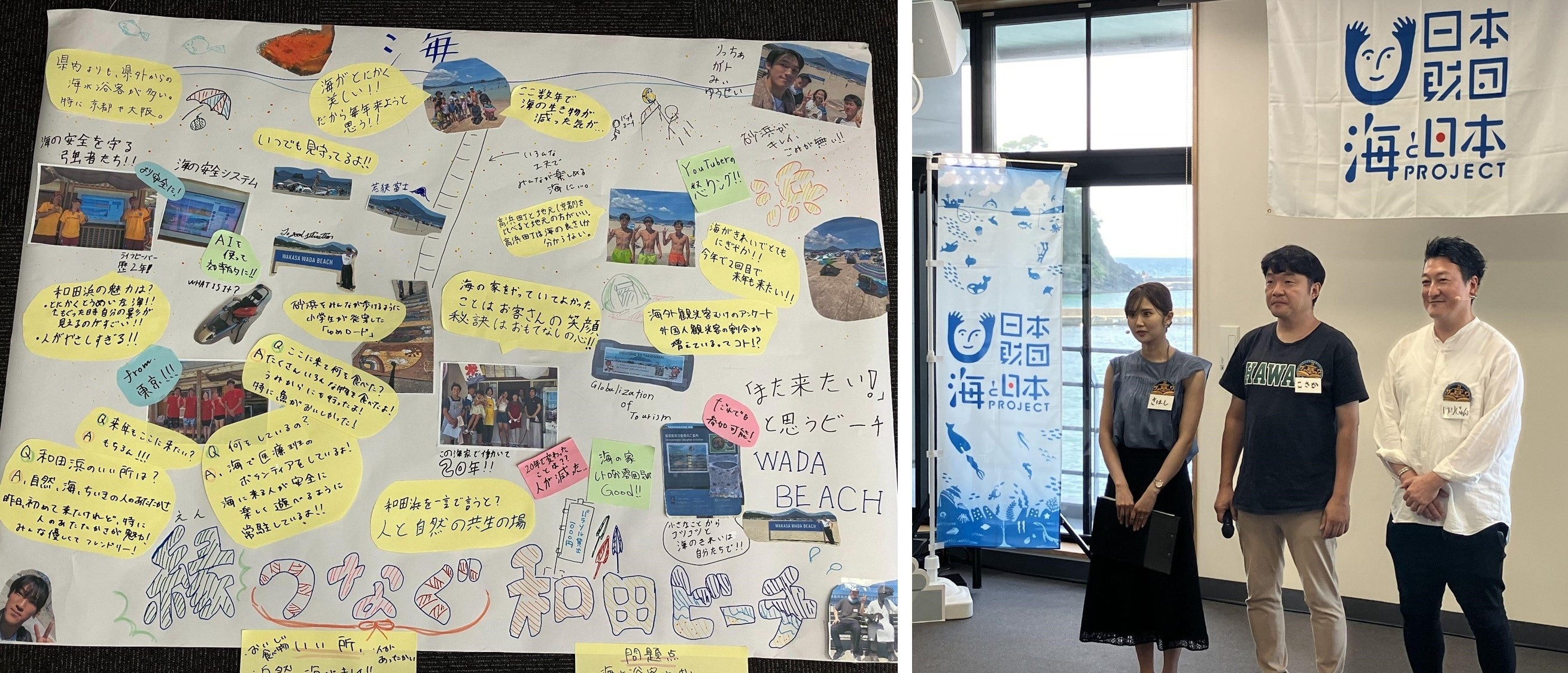 高校生たちがフィールドワークで地元の方から話を聞き、自分たちが見つけた人、言葉、モノなどマップ化していきます。その後、3班それぞれ完成したマップをもとに発表。高校生たちから出てきた高浜町のイマは「海を楽しめる工夫がたくさん!」「人と自然が共生している場所」「地域の中と外の縁を海がつないでいる」「本音を話せる地域の雰囲気」などの言葉で表現されていきます。互いの発表に意見を交換していくうちにそれぞれの持つ高浜町の現状が見えてきたのではないでしょうか。