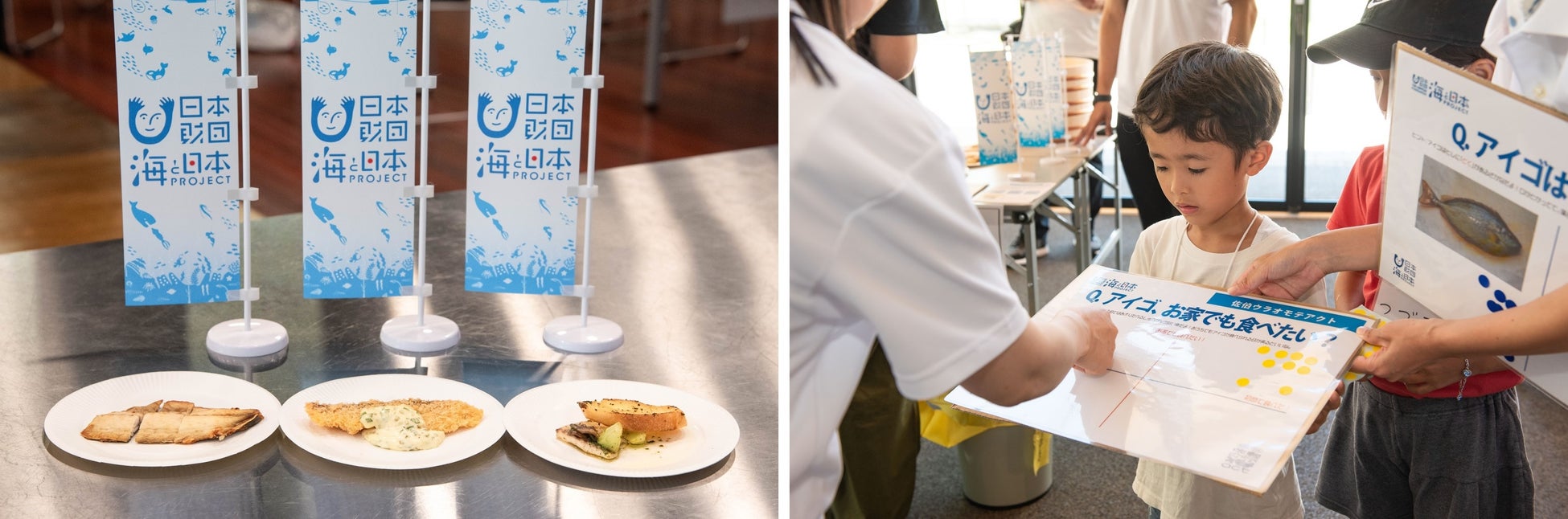 今回の試食ふるまい会では、多くの方に”アイゴ”・”藻場”・”磯焼け”などのキーワードに「美味しい」から知ってもらうべく、丁寧に処理されたやまろ渡邉のアイゴの干物・アイゴに親しんでもらうため工夫が凝らされた創作メニューが提供されました。創作メニューでは、オリジナルのタルタルソースを添えたアイゴのフライ、アイゴのアヒージョが提供されました。また、アイゴを子どもたちにも分かりやすく説明するため、クイズや試食後の感想が一目でわかるようなアンケートを実施するなどの工夫が行われていました。