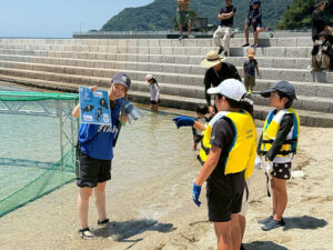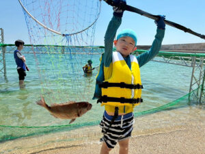 続いてのプログラムは、地元の水産資源のつかみ取り体験。体験が始まる前に、つかみ取りを通して学ぶ魚種の特徴について学びます。今回準備したのは、地元で養殖されているマダイ、シマアジ、スズキや天然魚のマアジ、ケンサキイカ、メジナなど約10種類。参加者はライフジャケットを着用し、実際の海の中に設置された特設のいけすの中で大きな網を使って魚を捕えました。中には、1キロを超えるサイズのマダイやシマアジもおり、魚が泳ぐ迫力やとげの鋭さなどを間近に観察することが出来ました。