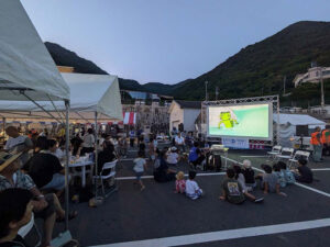 「かっぱMATURIサマーin明浜2025」のクライマックスである打ち上げ花火の前に、大勢の来場者が大型スクリーンの前に集まります。この日は、アニメ監督の沼田心之介さんとプロデューサーの柴田英知さんが来県。まずは、”カッパ”を題材にした全国の民話4作品を特別に上映。それぞれの民話ごとに、カッパの表情や人間との距離など地域によってカッパのキャラクターが異なっており非常に興味深い内容でした。続いて、本アニメの制作にも関わった地元の地域活動団体「高山よいとこな会」のメンバー3名が登壇。アニメ化の取り組みが始まる前にも、長年地域で続けてきた伝承活動についてお話しいただきました。いよいよ、「河童の恩返し」の上映です。地元の子どもたちの中には、既にアニメを見たことのある方が非常に多く、地域で積極的に活用されている様子が伺えました。上映会の終了から一拍置いて、海辺から大きな花火が上がり、イベントはフィナーレを迎えました。「アケハマリンフェス2025」を通して、地域に根付く海と人々との深い関わりについて考えるきっかけとなる一日となりました。