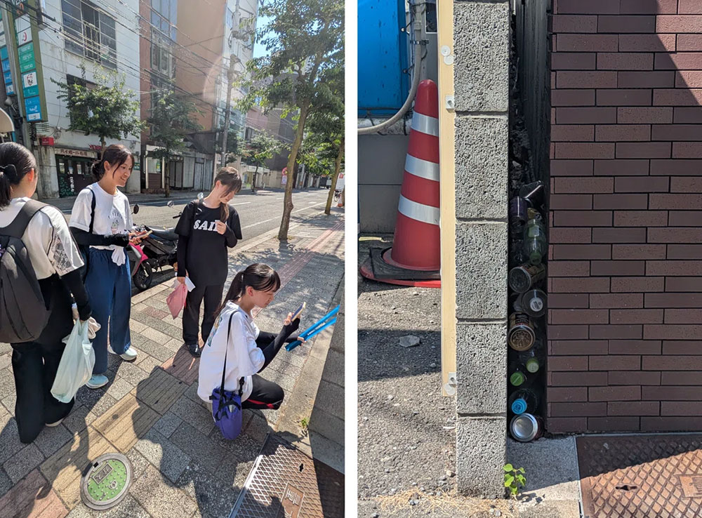 会場周辺には、大街道商店街というアーケードのある商店街があります。両側に広がる小道も、一見すると全くごみが落ちていないのですが、建物の隙間に大量のペットボトルが!発見した高校生たちも驚きながら、「なんでこんなところに溜まっているのだろう?」「同じ人が溜めていっているのかな?」と疑問を口にします。