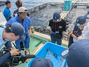 2日目の午前中に訪れたのは、愛南町赤水のヤマニ中田水産です。ヤマニ中田水産では、御荘湾の沖合いにある三ツ畑田島周辺の潮通しのよい海域に養殖いけすを設置しており、マダイやマサバなど数種類の魚種を養殖しています。講師を務めて下さった中田知公さん、大戸友也さんらの案内の元、船で沖合いの養殖いけすまで移動し、日々の作業の1つである魚体計測の作業を体験し、養殖魚の生育状況を確認しました。続いては、(一社)Umidasの清水陽介さんを講師に迎え、愛南町内で進める”海業”の取り組みについて学習します。”海業”とは、「海や漁村の地域資源の価値や魅力を活用し、地域のにぎわいや所得と雇用を生み出すこと」と定義されており、まさにブルーエコノミーの考えと合致する点が多くあります。この春発足した(一社)Umidasでは、これまで町内で取り組んできた「Jブルークレジットの認証取得」、「海洋ごみ回収」、「魚食教育」などを地域の観光資源と組み合わせ、経済循環を生み出す仕組みの構築を目指しているそうです。
