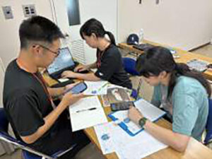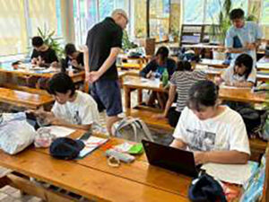2日目の午後のプログラムは西海観光船を訪問し、ダイビングインストラクターの高橋翔さんから、マリンレジャーとブルーエコノミーの繋がりについて座学で学びました。その後は、実際に海に入ってスノーケリングを体験。この日は、遠くを通過した台風の影響でうねりが残ったことから、当初予定していた沖合いの鹿島周辺ではなく、沿岸に近いエリアでのスノーケリング体験となりましたが、多種多様な海の生物を自分の目で観察することが出来ました。最後のプログラムは、2日間のまとめ学習です。2日間のプログラムに全体講師として帯同した(一社)探究科学研究所の里浩彰先生からのアドバイスを受けながら、参加した生徒は2日間で学んだことを生かして「ブルーエコノミーの視点を持って宇和海で事業を興すための事業計画」を作成しました。参加した生徒からは、「持続的な養殖漁業とするために、養殖技術の専門学校を設立する」、「海洋ごみ回収活動をもっと身近にするために、自治体と連携した地域ポイントを付与し生活に利用できる仕組みを作る」など、高校生の視点から様々なアイデアが生み出されました。