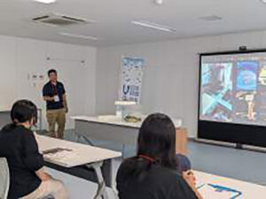 7月26日(土)~27日(日)に行われたプログラム①の初日は、宇和島市の愛媛県水産研究センターからスタート。最初の講師は、(一社)海洋産業研究・振興協会副主任研究員の田中元先生です。ブルーエコノミー分野の研究者である田中先生から、ブルーエコノミーという言葉が示す意味や、ブルーエコノミーに関連する産業にはどのような分野があるのかを学びます。田中先生によると、日本におけるブルーエコノミー産業は現時点で約40種類あるとのこと。また、今後ブルーエコノミー産業の規模としては、2025年から2050年にかけて約1.7倍に成長する予測があることを学びました。ただし、水産資源の枯渇や海洋ごみ問題など、解決すべき課題も多いとのこと。今回のプログラムを通して様々なブルーエコノミー産業を学び、宇和海で経済活動をしながら持続的に利用するためにはどのような考え方が必要か、高校生の視点で考えます。続いては、愛媛県水産研究センターの渡邉昭生センター長から、宇和海の水産業について学びます。座学の後は、センター内で飼育している様々な魚種を見学。愛媛県では、新たな魚種としてマサバの種苗生産技術開発、養殖技術開発に力を入れており、この日は屋内の円形水槽を泳ぐマサバを見学することが出来ました。