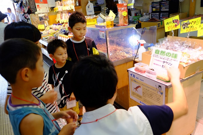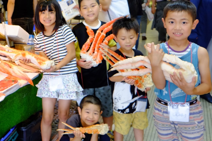さきいか屋さんでは、でき立てのさきいかを試食させてもらったり、カニ屋さんでは大きなカニを持たせてもらうなど、楽しい経験をたくさん重ねました。