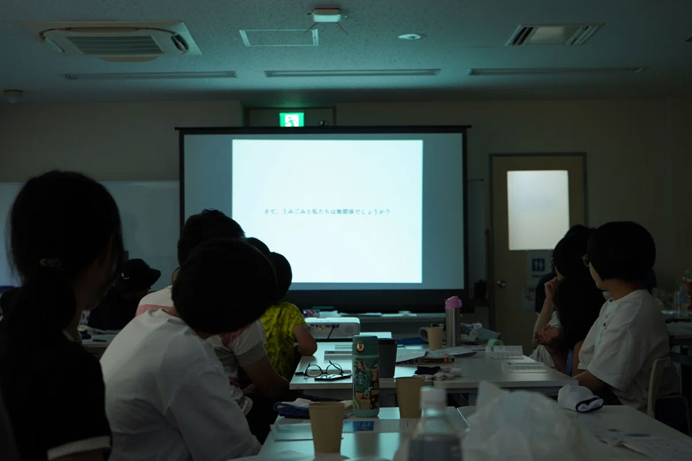 私たちが何気なく出しているごみが、沼や川、海へと繋がることでどんな問題が起こるのか、身近にある自然の豊かさを思いながら、私たちの暮らしが変化しつつあることを学びます。小学生にも分かりやすい言葉で、「海ごみの約8割は街から流れてきたごみであること」や、「プラスチックごみが海の生き物や人に与える影響」などをスライドで伝えました。