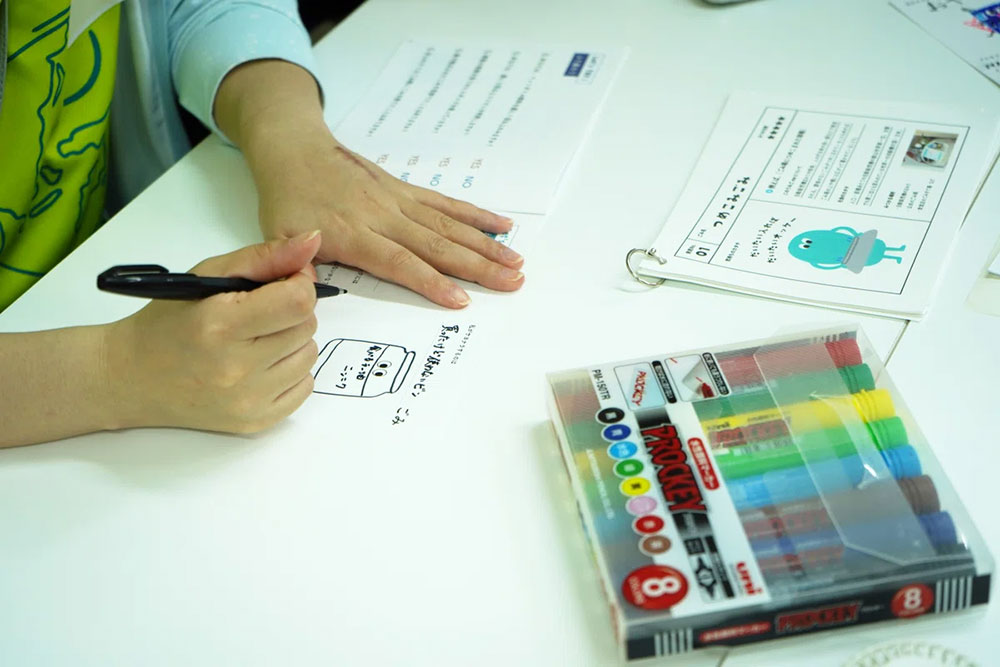 うみごmeのワークブックを見ながら、ごみの分類を考えます。人の気持ちと社会の構造、ごみの関係を知り、自分自身もごみを出している1人として、海ごみの課題に向き合う時間です。実際に自分で拾ったごみは、始め「他人が捨てたごみ」だったのに対して、ワークを進める中でごみを捨てた人の気持ちを考え「自分も無関係じゃない」という気づきを得たみなさん。最終成果物として、大人も子どもも、それぞれがお別れしたいオリジナルのうみごmeを描きます。