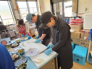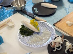 参加者の皆さんは「ぎょぎょたく糸島」の松永拓也さんから丁寧で分かりやすい指導を受けながらスミ袋を破らないように楽しみながらコウイカを捌き、キレイに盛り付けをして、魚介類を捌くことの楽しさを知ることができました。