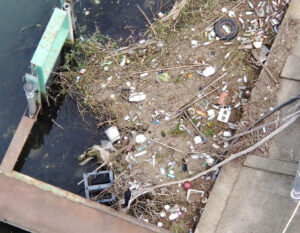 ごみが溜まっている場所は川床から高さ4mのコンクリートの護岸部分で、一時的に増水した時に流れているごみが減水したことにより、ごみが溜まりやすい場所に残ったと想定され、ドローンが撮影した画像から組成を見てみると、流木や灌木等の自然物やペットボトルをはじめとするプラスチック類といった長良川河口まで流出している要素と一致しており、海洋ごみとの相関関係が見られます。