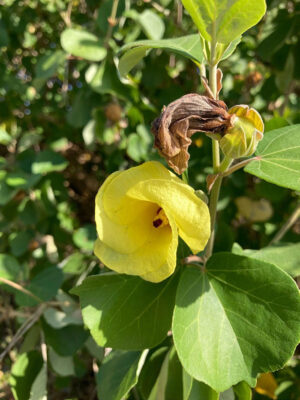 ハマボウの黄色くて可愛らしいハマボウの花が咲いているのを見つけました。既に咲き終わって実を結んでいるものもありました。また、ハマゴウの実が多数なっていました。昔の人がその良い香りを利用して枕に入れていたんだよ~という話をすると、子どもたちは実の香りを嗅いで「いい匂い!」「すごい匂いだなぁ」「枕に入れるのはちょっとなぁ」などと感想を話してくれました。