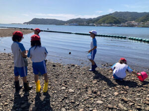 干潟で生き物と触れ合ううち、子どもたちは夢中になり、服が濡れるのも気にせず水辺で活動する姿が見られました。知識の習得だけでなく、五感をフルに使って自然を体感するこの経験は、子どもたちの心に深く残る、本質的な環境学習となっています。この成ヶ島という恵まれた環境が「生きた教室」として機能しているのは、「成ヶ島を美しくする会(成美会)」の皆様の、長年にわたる漂着ゴミの清掃や自然観察の場づくりの活動のおかげです。今後も、子どもたちの「知りたい!」という探究心を育む、貴重な学習機会として継続していけたらと思います。