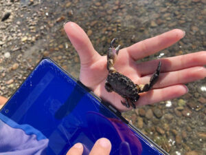砂場を深く掘っていた子どもはテッポウエビを見つけました。パチパチと音が聞こえて「何の音?」と観察してみると、テッポウエビがハサミを鳴らしている音でした。海の浅瀬ではイシガニも発見できました。