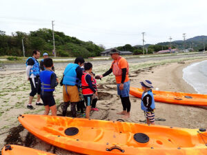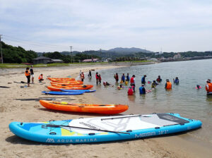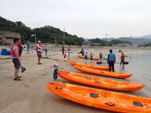 淡路市野島の北淡県民サンビーチで開催したカヤック体験と生き物観察会、ビーチクリーン活動に、淡路市、洲本市、神戸市から参加してくれました。カヤック体験の講師は、B&G財団で研修を受け、プロとして活躍するいざなぎサップの植野さんです。今年度の開催へ向けて、春から会場となる兵庫県淡路県民局、淡路市役所と打ち合わせを重ねました。兵庫県と淡路市が管理する北淡県民サンビーチの利活用として、トイレ、シャワー、更衣室が完備されたコンクリート製の東屋を、水道代は当法人が支払い、電気代は淡路市が支払い、建屋や駐車場は無償で使えることになりました。昨年度は3人乗りのシットオンカヤック6艇と用品を購入、さらに参加者が楽しめるように、今年度は子どもなら12人程度乗れるメガサップ、パドル、必要な用品を購入し、スタッフで会場を片付け、清掃するなど準備を進めました。
