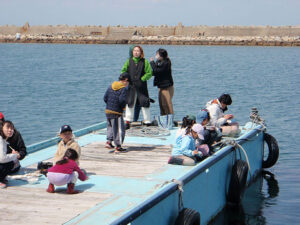調理体験後、自宅から用意したおにぎりと飲み物と一緒に、旨みたっぷりの刺し身、炭火で塩焼きした魚をおかずに昼食の時間です。あちこちで美味しいとの歓声があがるので嬉しいですね。残った魚の身やあらはジブロックにいれて持ち帰ってもらいます。内臓やヒレなどは海にリリースします。今回も海鵜、カモメ、トンビ、アオサギなど多くの鳥や漁港に住み着く猫たちが集まってきて食べていました。参加者は都会に住む人がほとんどなので、魚のあらを生のままバリバリとたべる野生の鳥や漁港の猫のたくましさに驚かれていました。この事業では毎回しおりを配っています。