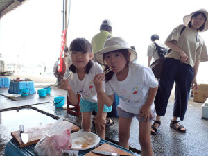 調理体験は鯛の三枚おろしです。配布した資料に詳細な解説があり、スタッフが参加者を集めて見本を見せてから、それぞれ家族単位で三枚おろしに挑戦しました。参加者の中には出刃包丁、柳包丁を持参する人もいたことは驚きでした。魚の調理が得意なスタッフ剱持さん、福山さん、河村さん、重本さんなどがそれぞれの家族の調理のサポートに回ってくれました。スキルの高いスタッフに恵まれていることに心から感謝しています。調理体験後は炭をおこしたBBQコンロで塩焼きにして美味しく食べました。漁協理事の田中さんもスタッフ参加してくれて、漁師直伝のあら汁をつくって参加者に振る舞ってくれました。今回は、珍しく揺れる青い桟橋で食事をするご家族が多くいました。桟橋から魚のあらを投げるとトンビやカモメが飛んできて、上手くいくと空中でキャッチするので参加者から拍手があり、皆さん楽しまれていました。