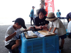 仕掛けたかごを引き上げて生き物観察会のあと、魚の調理教室を開催しました。魚の調理を指導するスタッフは全員出刃包丁を持参しています。作業場所、包丁、まな板などの設置も手際よく準備してくれます。今回も小さなお子さまはうろこ取り、大きなお子さまや大人の方は魚の締め方とさばき方を丁寧に教わりますので、参加者全員が天然鯛をさばくことに関わってもらいます。今回も漁協のご厚意でたくさんの魚を用意してもらったので、ひとり2~3匹の天然鯛の三枚おろしの調理体験ができました。中学生の男の子は、鯛から始まって、最後はハマチの三枚おろしにも挑戦していました。話を聞くと、活きた魚と触ったことも調理体験をしたことも初めてだったそうですが、とても美しい三枚おろしを完成させて持ち帰ってもらいました。海に親しむことのイベントとして開催していますが、このような体験がその子どもの将来の職業に繋がることがあれば素敵だな~と、イベント後のスタッフミーティングで感想が出ていました。