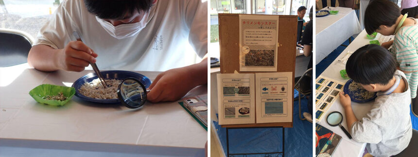 「チリメンモンスター」とは、チリメンジャコに混ざっているさまざまな小さな海の生き物たちのこと。普段は取り除かれてしまうそれらを、今回はあえて取り除いていないものを使い、ルーペや図鑑を使ってじっくり観察してもらいました。