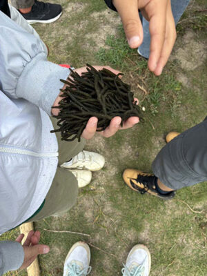 虫に詳しい竹田先生と一緒に浜を歩き、鳥以外の生き物や植物にも目を向けた観察も行いました。スズメガやキアゲハの幼虫を捕まえて観察したり、海岸に咲くハマゴウの香りに癒されたりと、五感をフルに使って自然の豊かさを感じました。