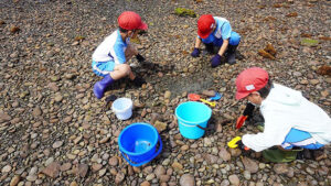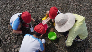 干潟で生き物とふれあっているうちに、子どもたちの緊張もすっかりほどけ、最後には海に足を入れたり、服が濡れるのも気にせず夢中で遊ぶ姿が見られました。自然の中で思いきり体を動かし、いきものの命にふれ、発見し、感じる。そんな“心と体で学ぶ”時間こそが、子どもたちの記憶に長く残る、本質的な環境学習になるのだと思います。
