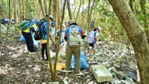 丸亀市沖にある手島では、季節風や潮位の影響で都市部などから流出したごみが漂着しやすく、生活ごみや漁業関連ごみが多く見受けられました。また、海岸付近よりも藪の中に入り込んでいるごみが目立っており、細かく砕けてしまった漂着ごみも多かったです。今回の清掃活動では、そんな細かいごみも見逃すことなく回収、広い範囲の清掃場所でごみの量も多い中、参加者によって漂着ごみが一掃されました。回収したごみ凡そ3.1tはフェリーで島に輸送したごみ収集車やトラックに直接積み込み、島から持ち出して処分しました。