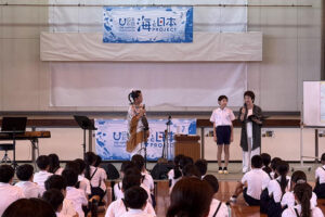 9月9日(火)は、鹿児島市立鴨池小学校で元ちとせさんによる第1回特別授業を開催しました。同小学校体育館にて6年生3クラス計84名の児童と保護者約30名が参加。元ちとせさんは出身地・奄美大島の伝統民謡“シマ歌”を披露。海にまつわる「ヨイスラ節」やオリジナル曲の「おやすみ」の2曲を歌いました。また、子どもたちも鹿児島の海がモチーフになったとされる「われは海の子」(諸説あり)を元さんと一緒に合唱しました。元さんの歌声や自身の生まれ育った”奄美大島の海”での体験や地元の海への想いなど、様々な海にまつわるお話に、参加した児童は真剣に耳を傾けていました。
