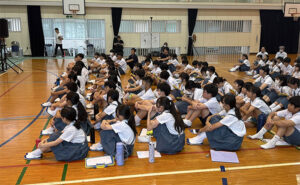 9月10日(水)は、鹿児島市立中郡小学校で元ちとせさんによる第1回特別授業を開催しました。同小学校体育館にて6年生2クラス63名、5年生2クラス59名、計122名の児童と保護者約45名が参加。元ちとせさんは前日同様に「ヨイスラ節」と「おやすみ」の2曲を披露。最後は子どもたちと元さんが一緒に、鹿児島の海がモチーフになったとされる「われは海の子」(諸説あり)を合唱しました。元さんの歌声や自身の生まれ育った”奄美大島の海”での体験や地元の海への想いなど、様々な海にまつわるお話に、参加した児童は真剣に耳を傾けていました。