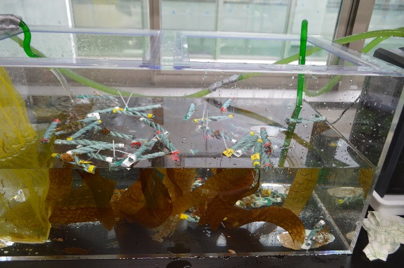 光の強度や水温など、自然環境とは異なる条件下での育成であったことから、必ずしも想像通りに種苗が成長したわけではありませんでした。ただ、ガゴメでは、諸条件下での一定の傾向を見ることができました。