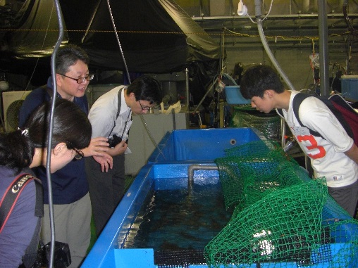 講座終了後、参加者は、川越さんの案内でセンター内にある研究施設を見学しました。函館市国際水産・海洋総合研究センターは、31室の研究室があるほか、大型実験水槽や飼育培養施設などの共用施設などを備える、水産・海洋に関する日本有数の研究施設です。