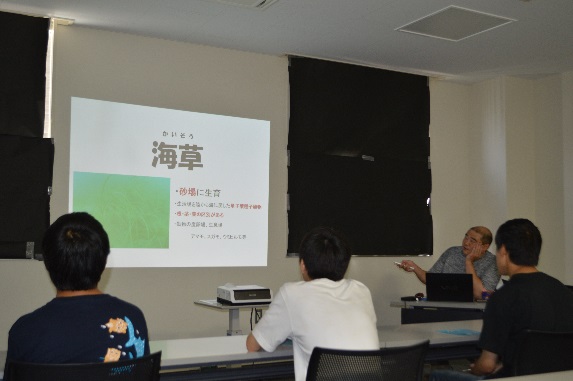 ワークショップは、まず、共和コンクリート工業(株)海藻技術研究所主任研究員・川越力(かわごえ・ちから)さんから、海藻に関する基礎知識について講義が行われました。講義は、「海草」と「海藻」の違いから始まり、海藻の生物群の種別や各海藻の特徴などについて、時折参加者に質問をしながら、進められました。