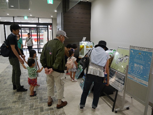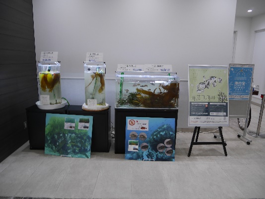 5月31日からは、キラリス函館1階ロビーにおいて、函館近海に生息する魚や海藻の飼育・展示が行われました。また、7月20日からは、海洋センターのワークショップにて種苗にしたガゴメやアカモクも展示、ロビーの一角は、来場者が「函館の海」を体感できるスペースとなりました。