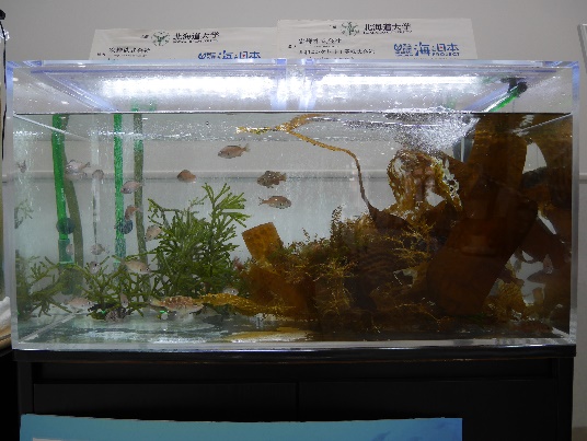 魚は、マダイ、クロソイ、エゾメバル、キツネメバルの4種、海藻はガゴメ、アカモク、ミルが展示されました。食卓に上る魚の子どもたちが水槽内を泳ぐ姿に、大人も子供も興味深く眺めていました。
