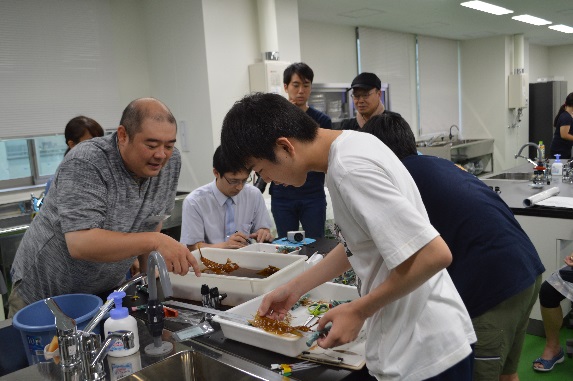 9月2日、キラリス函館内にて、種苗の最終観察と取りまとめが行われました。まず、参加者は、水槽から取り出した種苗の計測を実施、その上で、2ヶ月間の計測をまとめると共に、データから読み取れる事項をそれぞれ分析しました。