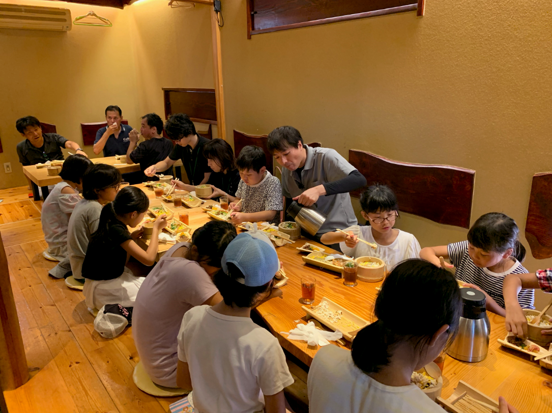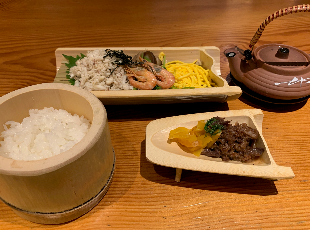 お昼ごはんは、地元の伝統料理「魚飯」。この「魚飯」は、竹原の塩田の持ち主が客人をもてなす時に作られたそうです。白身魚を焼いてほぐしたものと錦糸卵に三つ葉、しいたけ、エビ、ノリなどをご飯にのせて、だし汁をかけて食べる、北前船による富がもたらしたぜいたくな一品です。