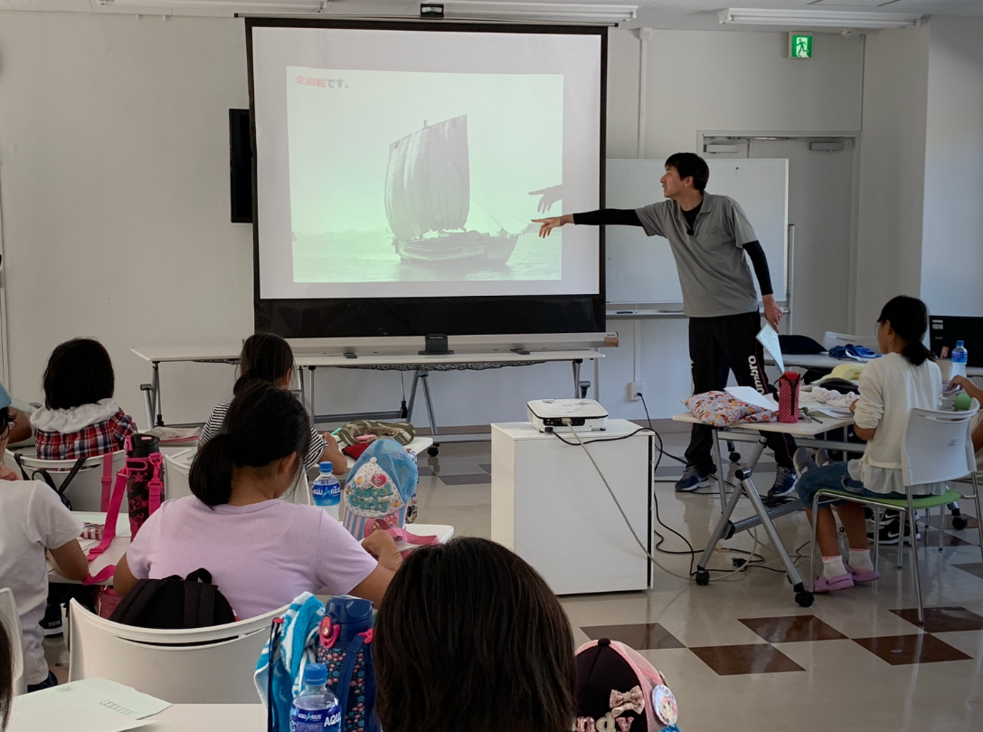 子どもたちはライフジャケットの着用方法、乗船の際の安全講習の後、クルージング船に乗って瀬戸内海に出て潮流体験をしました。海上に浮き輪を投げて潮の流れを観察したり、周囲の島々を観察したりしました。北前船には現在の船のようなエンジンは搭載されていないことも教えてもらい、瀬戸内海の潮の流れの中を航行することが、いかに大変だったかを想像していました。