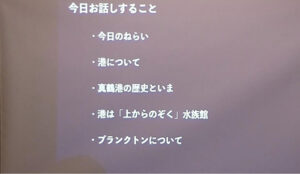 「港は生物のオアシスだ、と言うことを知ってほしい」という講師の言葉から講座が始まりました。また部屋から外をみるときの「窓」のようにいろいろな生物が見られるけれども、さらには生物学的・生態学的にも意味のある場所だと感じて欲しいと講師は語ります。また社会と海との接点でもあり地域の産業やそれにともなう港の使われ方なども感じてもらい、横浜の港についても想いを馳せてもらうのが今回のねらいのようです。