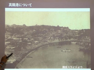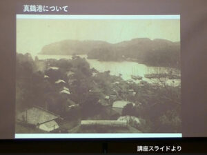 明治~大正期の写真が映し出され現在との比較をしました。貴船神社が現在よりずっと下がった海岸にあり驚きましたが、現在の位置へ移転された理由は関東大震災の津波による流出だということでした。海辺のまちは津波との闘い(防災)も重要課題ですね。