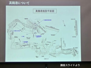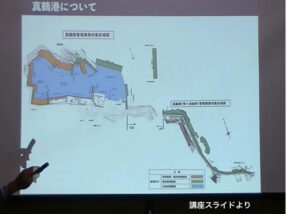 平面図上での解説では魚市場としての利用、漁船(大小、各種あります)の利用、網干場としての利用、遊漁船での利用、賑わい施設(飲食店)の利用などが行われています。駅から降りてきて正面にある岸壁は耐震岸壁として整備され災害時に活躍してくれる予定です。ただ普段は着岸する船は多くなく、釣り人が利用しているようですが、港湾施設だと理解していない(釣り専用だと勘違い)釣り人が船の着岸に文句を言うなど本末転倒なことも時にはあるようです。平面図の右橋にある縦一文字のものは港の入り口で波とうねりを防いでくれる防波堤です。この港の利用に関しては水井講師の講座ならではのオフレコ話がいくつもあり、感心したり頷いたりと楽しい時間でした。