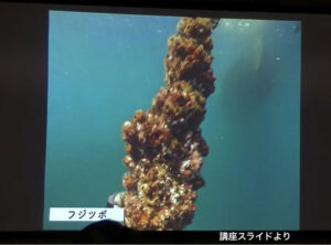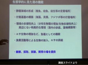 講師の「港で生き物探しをするのが大好きです」と言う言葉で講座は進みます。とくに夜が面白いそうです。暗いので安心して岸壁に寄ってくるようですね。スライドでは静穏海域の形成・漁港がたくさんあることで小さな生き物のゆりかごになってくれる、付着基盤の構築・特に砂浜に港を作ることでたくさんの海藻、貝・フジツボ等が付着する場所になる、環境の多様性向上・生き物の種類や生息数が増えたり、砂が滞留したり藻場ができたりなどたくさんの港があることの良い影響について語られました。さらには私たち海族としても「観察・採取・実験・飼育」の場を提供してくれます。講師も博士論文のための研究素材をここで採取していたそうです。