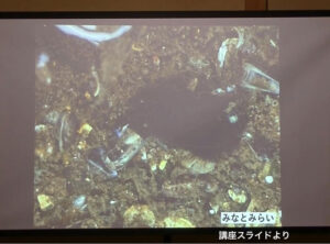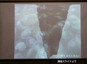 港があることで大型魚が入ってこられず安全な環境が作られること、また多様な生物をはぐくむ機能からこれまで見なかったクロシタナウミウシの幼生をみなとみらいで見ることができたなどの事例が紹介されました。今年のみなとみらいや大岡川の岸壁はミドリイガイや緑色のアメフラシ(不明)が多かったようです。