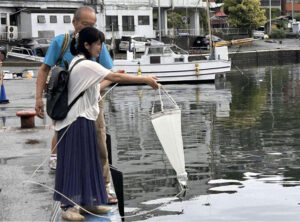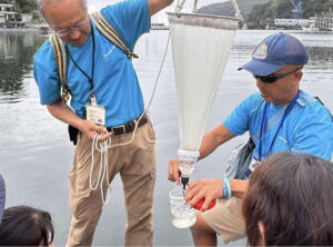 講師は講座中も雨レーダを見ながら状況を判断してくれていました。「ちょっと30分くらい雨がやみそうなので、港にプランクトン採集に行きましょう!」と会場を出て港に向かいました。今回の講座が始まるとき「これまでの講座ではプランクトンを見てもらうことはあっても採集したことはないですよね?じゃんけんで負けた人は海に飛び込んで採集して来て下さい。」とみんなを笑わせていましたが、ちゃんとプランクトンネットが用意されています。渡部さんの指導でプランクトンネットの使い方や採集の方法を学び、それぞれ挑戦していました。ネットが水面から出てしまったり、深いところに沈んでしまったりとなかなか難しいようです。今回は水面下30センチくらいのところを3回ほど繰り返して採集してきました。その間も岸壁をのぞき込んで盛り上がる受講生も。採集が終わるころ再び雨が強くなってしまったので、港内の視察は中止し、講座会場にもどりそのままプランクトン観察を開始しました。