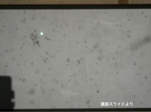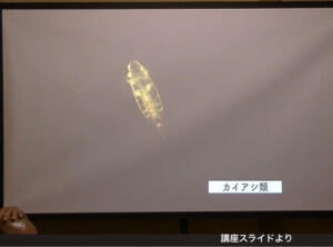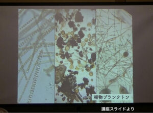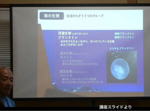 講座会場にもどると講師からの質問です。「プランクトン、プランクトンと言っていますが、プランクトンってなんですか?」。今回初めて参加された受講生が「大きさとか…小さい生き物ですよね?」と答えると答えると「罠にはまっていただいてありがとうございます」と講師が笑わせます。