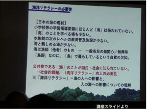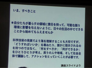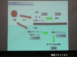 この後プランクトンの生息分布について、その理由となる陸から海への栄養供給について、海水温の上昇している現状や海中の栄養状態と下水処理などの話と続きました。このあたりは今年度第1回目の講座振り返りにも記載がありますのでそちらをご覧ください(ヨコハマ海洋市民大学のHPから)。