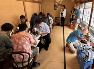このあと別室に移り事前に用意していただいた顕微鏡(40倍・100倍)で観察します。顕微鏡の使い方からプランクトンの観察まで渡部さんが担当してくれました。小さな丸いお皿に取り分けたプランクトンをまんべんなく観察できるような観察方法を教えていただき、それぞれが自身のスマホで撮影して楽しく学びなした。