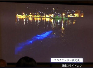 研究船に乗り沖合でプランクトンを採集すると今回の比ではない量のプランクトンが採集でき、さらにたくさんの姿を見ることができます。また季節によっても随分と違うものが観察できるそうです。沿岸でよく目にするプランクトンとして夜光虫が紹介されました。海が赤く染まってしまうやつです。昼間は汚く見えますが、夜間発光するときは幻想的です。夏に海が濁って見えるときは海が汚いのではなく実際にはプランクトンが大量発生していて「海は食べ物がいっぱいのスープ」な状態だと紹介されました。港の係留ロープにたくさんついたフジツボが触手を伸ばしプランクトンを摂取しているスライドでは「彼らはエビ・カニの仲間だけれど、なにかに固着して動かず生活することを選びました。それでも生きていけるくらい海中はプランクトン(食べ物)にあふれているということです。まぁ、人間でいえばコタツから一歩も出ずに生活できるってとこですね!」と笑いを誘います。