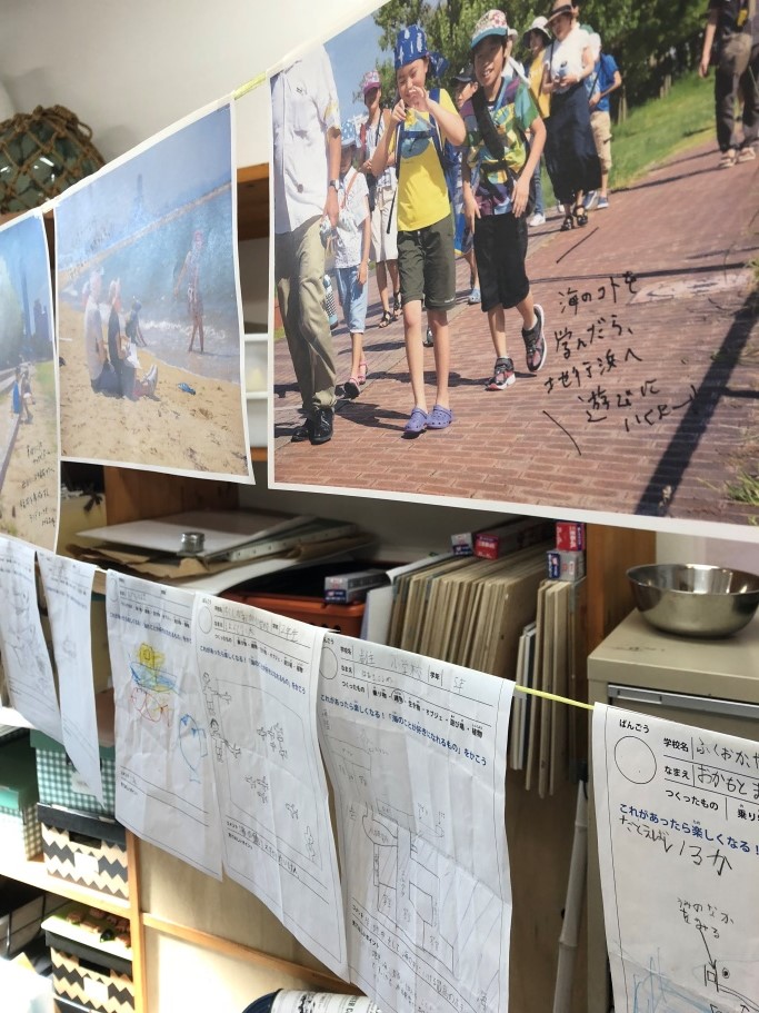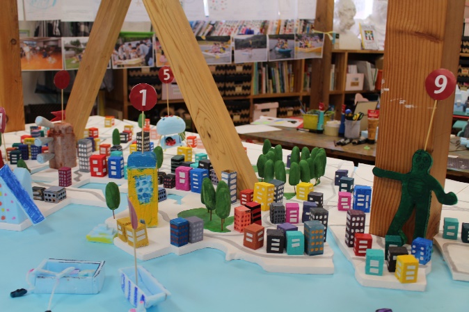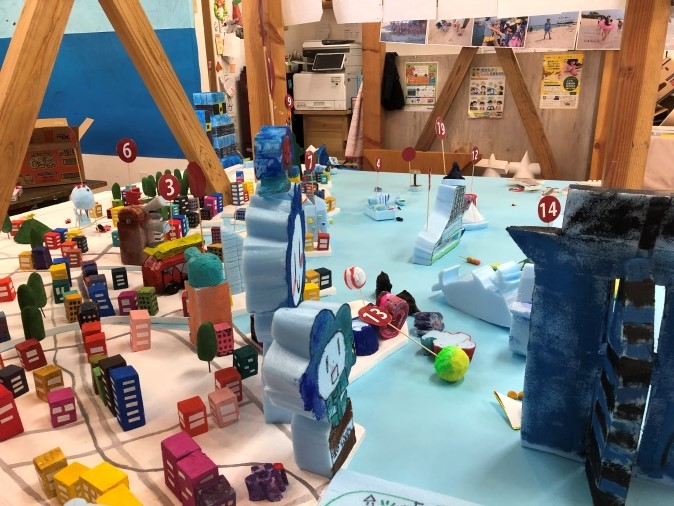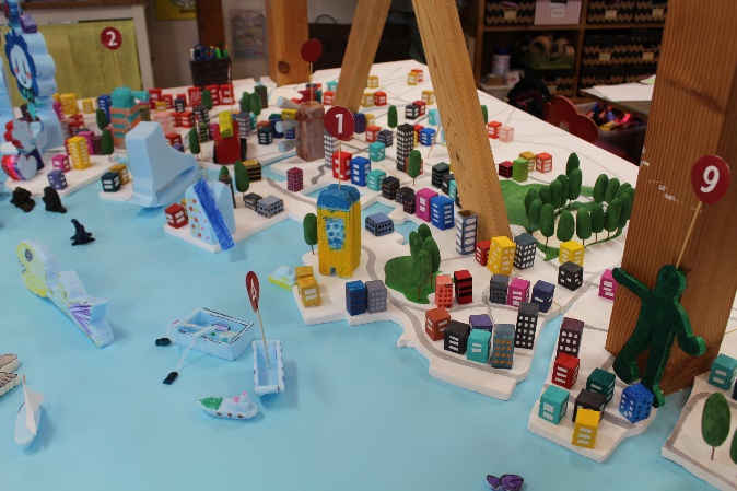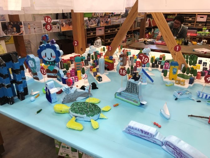 教室内中央のテーブル(2360×1976mm)上に「ふくおか」の土台を準備し、各プロジェクト後に作った模型を設置しました。模型のアイデアシートをガーランドのように飾り、配置した模型と数字で紐づけ、鑑賞者が模型の機能やデザインのこだわり、詰め込んだ発想をキャプションとして楽しめるように工夫しました。自分の作った模型をみつけた本人や保護者の方からは歓声があがり、詳しい制作秘話や、ほかのお友だちとの関係性、大きさの比較や海との関りについて、話を深める場面があちらこちらで見受けられました。