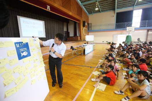 「海」を切り口にSDGsを楽しく学ぶ出張授業を、応募いただいた千葉県八千代市立大和田南小学校の5年生児童を対象に開催。ワークショップと事例紹介を通じて、SDGsの14番目の目標「海の豊かさをまもろう」に向けた持続可能な社会づくり、SDGsの考え方についての理解促進を図りました。 講師役は、日本ESD学会副会長の手島利夫氏、元朝日新聞社科学医療部記者の科学ジャーナリスト・山本智之氏が務め、子どもたちからは活発な意見が出されました。