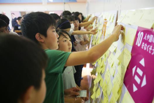 授業は、人類がこれまでに克服してきた事柄や、現在直面している問題などを考えてもらうワークショップ形式です。児童同士で相談もできるので、会場は大変にぎやか。一人ひとりが付箋紙に「これから私たちが克服していかないといけないと思う問題」を書き込み、それがSDGsの17個の目標の何番に当てはまるのかを考えて、ボードに貼っていきます。子どもたちからたくさんの意見が出され、みんなで考えを共有しました。