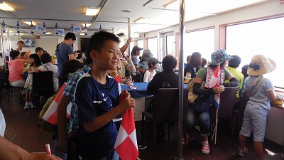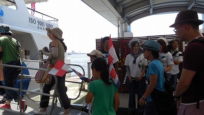 「おかえりなさい!」と 入港船に向かって、元気よくUW旗を振りました。