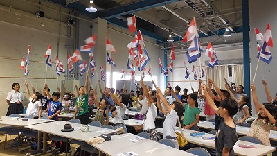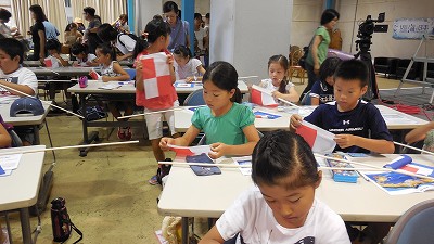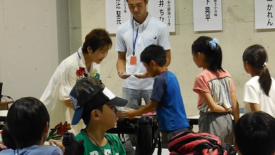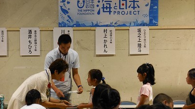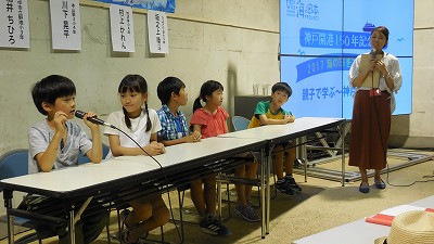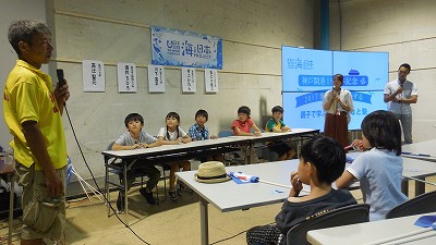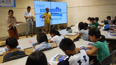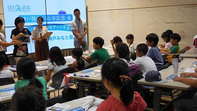 特別講師(平山好成氏:神戸商船大学卒 元神戸港振興協会職員で海、港、船に係るプロ)より、配布資料をもとに「海」「海の日」「神戸港」などについて、小学生向きに説明しました。その間、受講生に対し講師からの質問や受講生から講師に対し質問多々あり。ようやく、受講生も場になれて、和気あいあいの雰囲気が出て、主催関係者一同ホッとしました。
